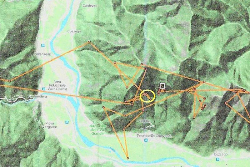 Terminato l’avvistamento, i militari hanno esaminato le fotografie scattate a caccia di indizi. Da una prima analisi si è potuto osservare un rigonfiamento atipico a livello del dorso, compatibile con la presenza di una trasmittente GPS. Grazie a questo dettaglio ci si è concentrati sull’analisi delle localizzazioni giornaliere dei gipeti rilasciati ed è emerso che Fredueli si trovava nel VCO il 24 gennaio nella zona di Varzo e il 25 nella bassa Valle Anzasca.