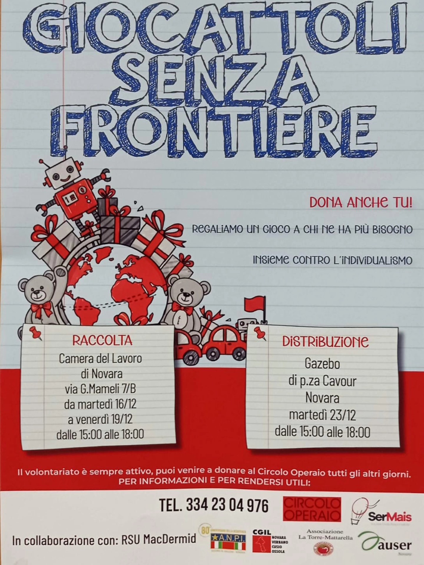 La raccolta dei giocattoli è prevista da martedì 16 a venerdì 19 dicembre, dalle 15 alle 18, presso la Camera del Lavoro di Novara, in via G. Mameli 7/B. Qui sarà possibile consegnare giochi nuovi o in ottimo stato, destinati a bambini e ragazzi.