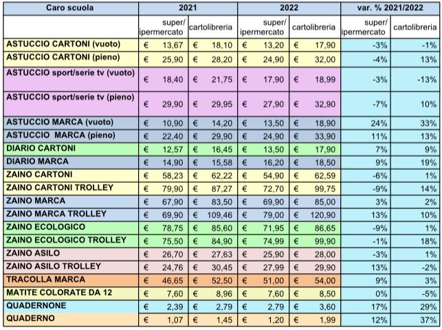 Dal monitoraggio effettuato dall’O.N.F. – Osservatorio Nazionale Federconsumatori i costi del materiale scolastico registrano un aumento medio del +4,3% rispetto al 2021. Complessivamente la spesa per il corredo scolastico (più i “ricambi”) ammonterà quest’anno a circa 571,60 euro per ciascun alunno.
