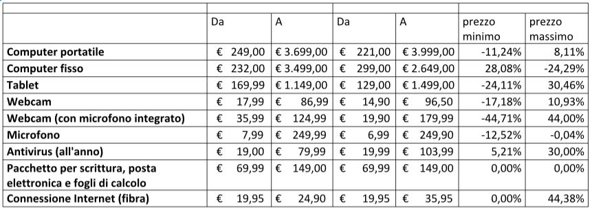 Dallo studio effettuato dall’Osservatorio Nazionale Federconsumatori emerge, infatti, che tra computer, webcam, microfono, antivirus, programmi base una famiglia spende da 369,88 Euro a 3.756,98 € (considerando per antivirus e programmi i costi su base annua). A questo va aggiunta la spesa per la connessione a internet. Acquistando prodotti tecnologici rigenerati, come emerge da un recente studio della Federconsumatori, si risparmierebbe il 38%.
