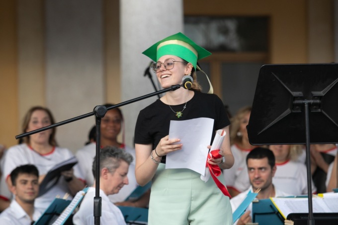 Ma il momento più toccante è arrivato con il valedictorian speech, il discorso simbolico di saluto, affidato quest’anno a Stefania Trombin e Francesco Romano Pivetta.