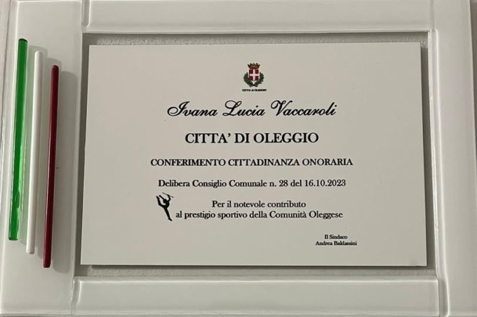 “Per il notevole contributo al prestigio sportivo della Comunità oleggese” recita così la targa consegnata a Ivana Vaccaroli dal sindaco Andrea Baldassini e dalla sua amministrazione e che ha suggellato quanto deciso nell’ottobre 2023 dal consiglio comunale oleggese.