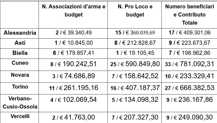 Sono 121 le associazioni – 84 Pro Loco e 37 Associazioni d’Arma– distribuite in tutte le otto province piemontesi che ora riceveranno della Regione Piemonte un contributo per complessivi 3 milioni di euro. È il risultato dello scorrimento della graduatoria del bando per la quale erano state dichiarate idonee, in attesa di finanziamento.