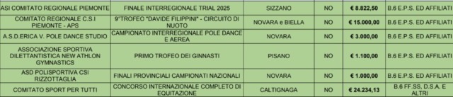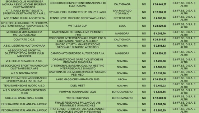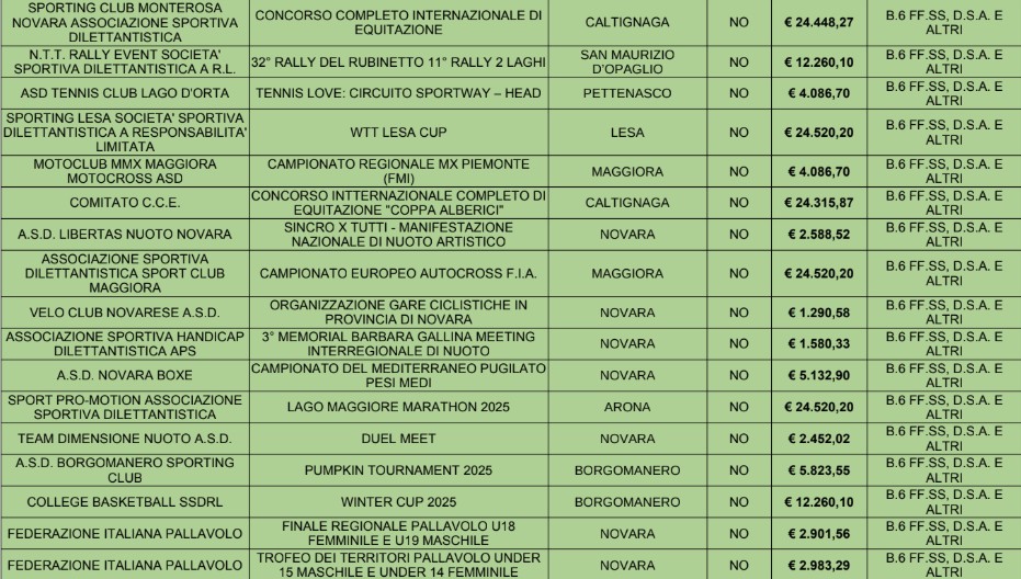Sono in totale 232 gli eventi sportivi organizzati in Piemonte fra il 1° gennaio e il 31 dicembre 2025 che hanno ricevuto il sostegno con la somma record complessiva di 2,2 milioni di euro dal bando regionale ad essi dedicato: 8 sono quelli organizzati in provincia di Alessandria, 16 in provincia di Asti, 12 in provincia di Biella, 60 in provincia di Cuneo, 23 in provincia di Novara, 93 nella città metropolitana di Torino, 7 in provincia di Vercelli, 5 nel Verbano-Cusio-Ossola più 8 eventi organizzati direttamente dai comitati regionali delle Federazioni Coni.