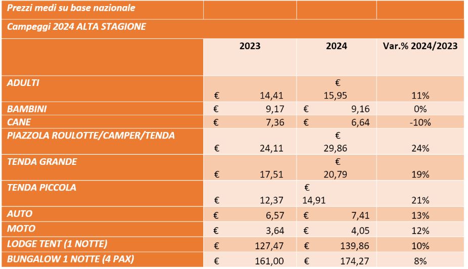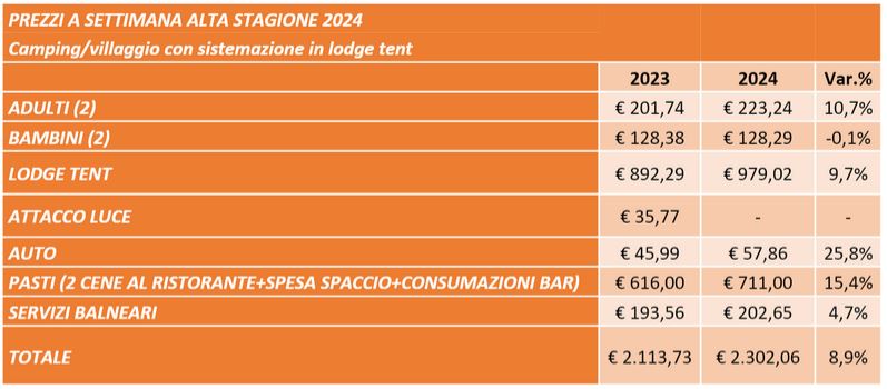 Alla luce di questi aumenti emerge che, complessivamente, una famiglia composta da 2 adulti e 2 bambini, per trascorrere una settimana in campeggio in una località balneare, tra piazzola, ingressi, pasti e servizi balneari, spende in alta stagione 1.526,09 euro, il 10% in più rispetto al 2023. Chi, invece, non vuole rinunciare alla comodità e preferisce soggiornare in bungalow spenderà 2.345,45 euro, l’8,1% in più rispetto al 2023 e il 66% in più rispetto alla soluzione in tenda.