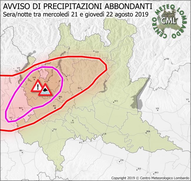 Codice arancione (moderata criticità) per temporali forti e rischio idrogeologico, a partire dal tardo pomeriggio di oggi, mercoledì 21 agosto, su Laghi e Prealpi Varesine Alpi e Lario e Prealpi occidentali. Le zone più a rischio  sono quelle della Provincia di Lecco, quella di Como, quella di Varese e , in Piemonte, di Novara e Vercelli. Dalla sera fenomeni più diffusi e organizzati su pianura centro-occidentale e settori prealpini occidentali, con possibile carattere di persistenza sulle Prealpi centro-occidentali e sull’alta pianura occidentale e al confine con il Piemonte.  Lo comunica la Sala operativa della Regione Lombardia la cui attività è coordinata dall’assessore regionale al Territorio e Protezione civile Pietro Foroni.