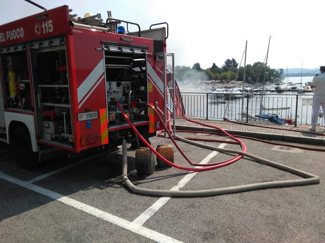 Barca in fiamme a Solcio di Lesa. I Vigili del Fuoco di Arona hanno spento l’incendio evitando che si propagasse alle altre imbarcazioni.