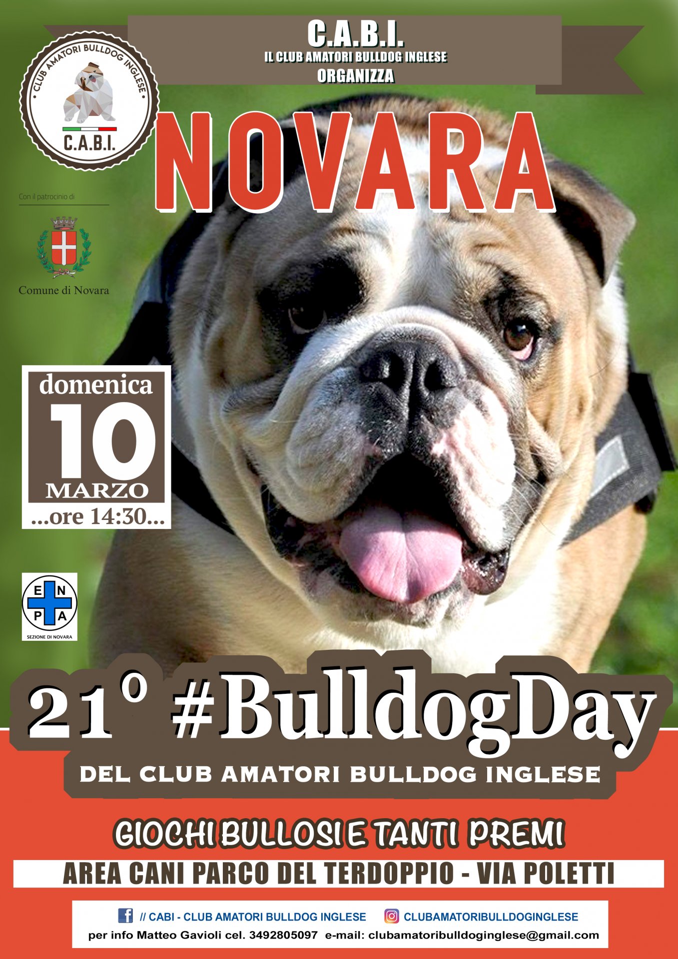 Grazie al patrocinio del Comune di Novara e al sostegno del Comitato Novara Nord, gli organizzatori hanno ottenuto l’autorizzazione per realizzare il mega-raduno nell’attrezzata area cani dove bulli e appassionati potranno giocare e divertirsi in libertà. L’evento sarà anche l’occasione per raccogliere fondi a favore di ENPA – Sezione di Novara, l’associazione che da anni si prende cura degli amici animali più sfortunati, abbandonati o che necessitano di cure mediche. Durante la giornata verranno proposti dei divertenti giochi da praticare con gli amici a quattro zampe, che allieteranno il pomeriggio dei partecipanti con esilaranti prove dei bulldog, e una simpatica sfilata di accessori “bullosi” proposta dal brand piemontese Switchdog.