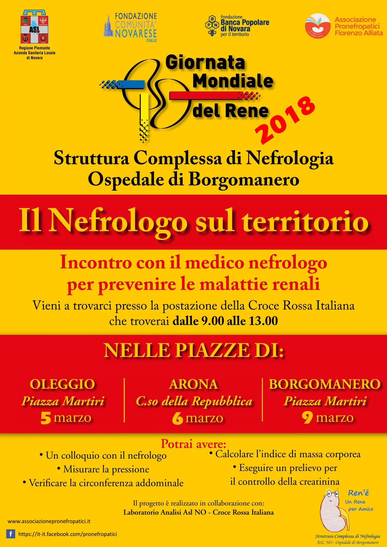 “Fai con noi un check-up gratuito per la salute dei tuoi reni”. Questo lo slogan della Giornata, che vede presente un presidio della Struttura di Nefrologia in sinergia con la Croce Rossa Italiana. Con il supporto operativo dell’Associazione Pronefropatici Fiorenzo Alliata di Borgomanero e la collaborazione del Laboratorio Analisi nelle piazze di: