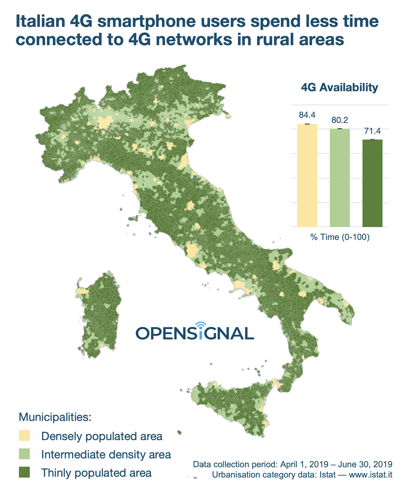 OpenSignal – con i dati ripresi anche da Mondo3 – conferma che gli operatori mobili hanno concentrato i loro sforzi di implementazione delle reti soprattutto in aree densamente popolate, dove gli utenti potevano godere di una maggiore disponibilità di 4G. Gli utenti nei Comuni rurali hanno trascorso meno tempo connessi alle reti 4G rispetto ai loro pari nelle aree suburbane e urbane, ma possono comunque godere di un 71,4% di disponibilità delle reti 4G, sottolinea la ricerca. 71,4 contro l’84,4 delle zone urbane, densamente popolante: 13 punti in meno. Ecco in sintesi il divario digitale della telefonia mobile in Italia. OpenSignal dettaglia poi i dati nelle macroregioni del Paese, specificando che non vi sono particolari differenza tra nord e sud.