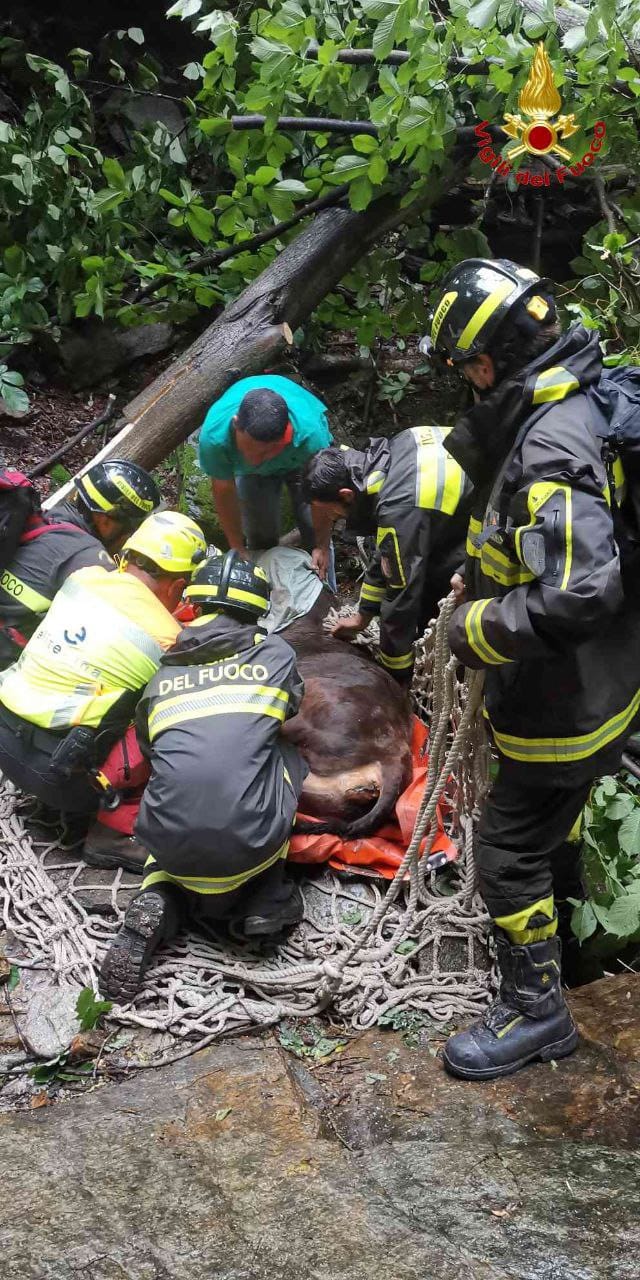 I vigili del fuoco del Verbano Cusio Ossola sono intervenuti a Calasca Castiglione nel primo pomeriggio di oggi, domenica 8 giugno, per due bovini precipitati nel letto di un torrente. L’episodio si è verificato in località Molini, e assieme ai pompieri dei distaccamenti di Domodossola e Macugnaga, sul posto sono arrivati anche i veterinari dell’Asl. Uno dei due vitelloni, un maschio, è stato trovato in condizioni critiche, e purtroppo non è riuscito a sopravvivere. L’altro animale invece, una femmina, è stato tratto in salvo dai vigili del fuoco fino a valle, in una zona aperta, grazie all’uso di una barella improvvisata con mezzi di fortuna. Lì l’esemplare è stato recuperato con un elicottero e ricondotto nella stalla dei proprietari.