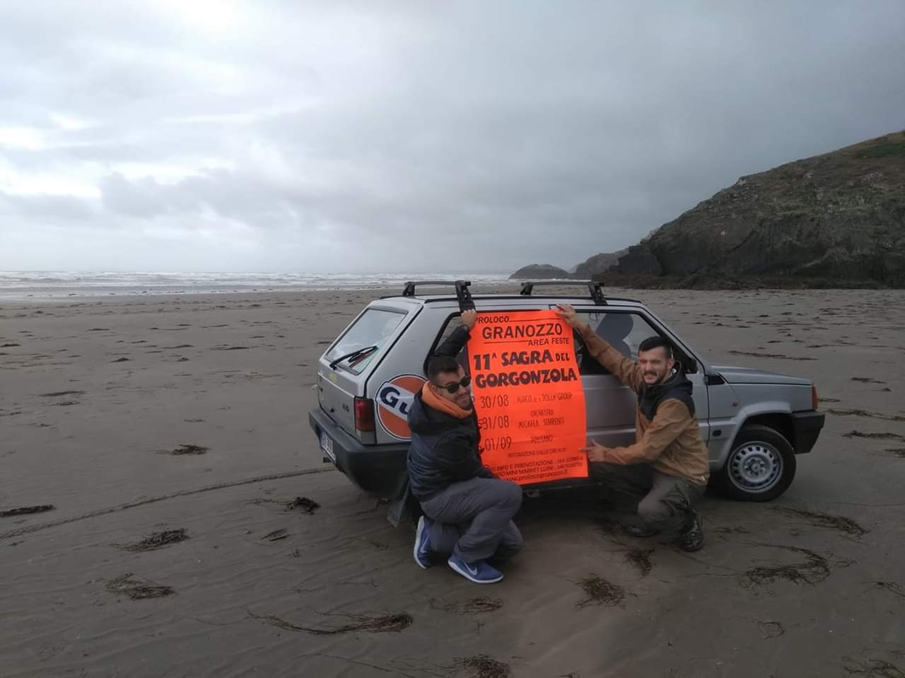 Anche lì è arrivato il manifestino della Sagra del gorgonzola di Granozzo. Poi l’abbiamo esposto anche a Black Rock Sands e a Stonehenge, dove abbiamo potuto solo avvicinare il manifesto al sito neolitico perché le guardie presenti ci hanno fatto capire che di più non avremmo dovuto osare…»