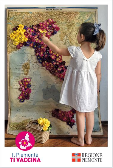 A partire dalla prossima settimana questa immagine simbolo della campagna #ilPiemontetivaccina sarà diffusa su tutto il territorio, con poster e cartoline in distribuzione negli oltre 130 punti vaccinali del Piemonte.