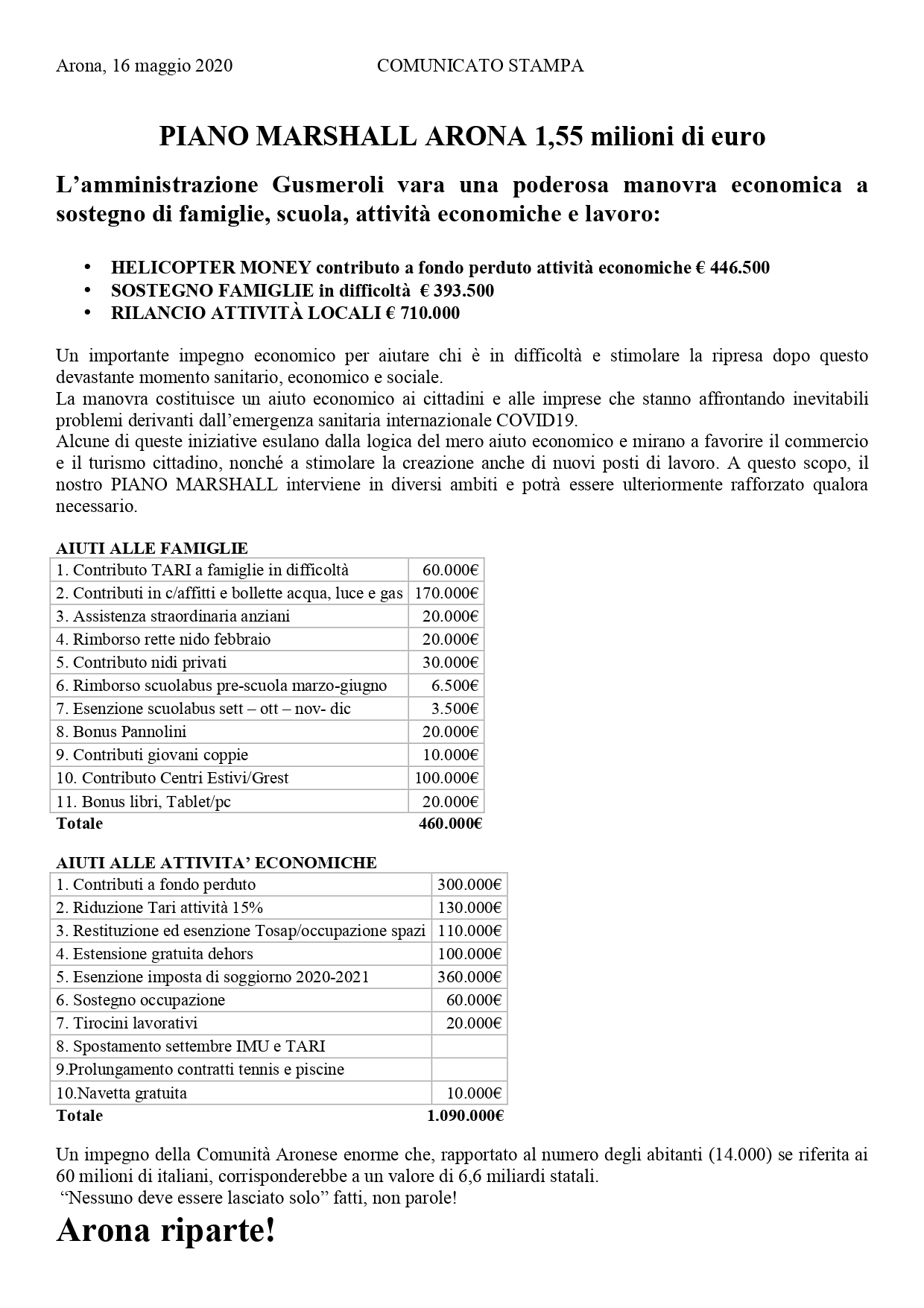 Con una diretta su Facebook il sindaco di Arona Alberto Gusmeroli assieme alla sua Giunta ha presentato quello che ha definito il Piano Marshall per Arona. Si tratta di una manovra da 1 milione e 500mila euro, divisa per due categorie, le attività economiche e le famiglie.