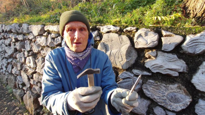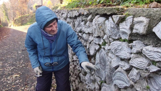 "Lo faccio da tutta la vita..." racconta, mostrando il piccolo martello con cui lavora quasi tutti i giorni, da sei anni, lavorando segno dopo segno le pietre che compongono un lungo muretto che costeggia il "suo" sentiero. È il muretto, ormai, ad essere diventato esso stesso un'opera d'arte.