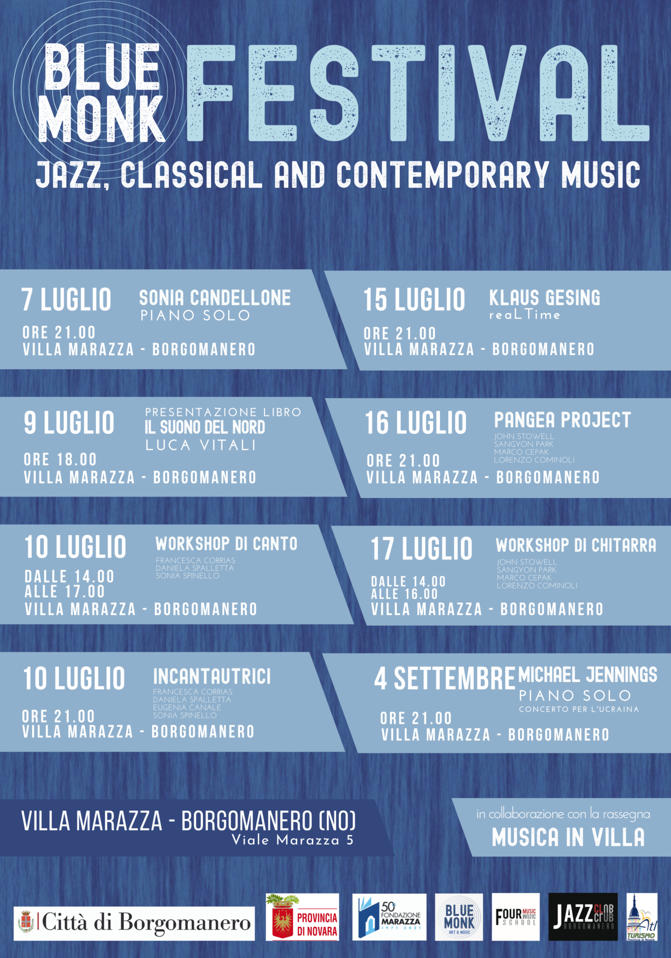 L’Associazione Culturale Blue Monk organizza una rassegna di concerti, workshop e attività culturali legati al mondo della musica Jazz, Classica e Contemporanea.  Le splendide location nei Comuni di Borgomanero (Villa Marazza), Orta S. Giulio (P.zza Motta), Pettenasco (P.zza Unità d’Italia), Ameno (parco neogotico) e Borgo  Ticino (Antica Casa Balsari) rendono ogni evento suggestivo e poetico. Il Festival si svolgerà in due parti: la prima dal 7/07 al 17/07 e la seconda dal 31/08 al 4/09.  31 artisti provenienti da 7 diverse nazioni, 15 eventi fra concerti workshops e presentazioni di libri, 5 Comuni della Provincia di Novara uniti dalla passione per la  musica. Oltre ai molti ospiti internazionali come Klaus Gesing, Mikael Godée, Thomas Markusson, Bebo Ferra, Sebastian Merk e molti altri, ci sarà spazio anche per  un concerto benefico a favore dei profughi dalla guerra in Ucraina. La manifestazione è realizzata con la partecipazione di Jazz Club Borgomanero e Four Music  School che da anni promuovono attività musicali sia concertistiche che didattiche di qualità sul territorio del Novarese e del V.C.O. Hanno inoltre contribuito:  Fondazione Marazza di Borgomanero, Antica Casa Balsari, Fausto Dasè e Sound Lab S.r.l., Confcommercio Alto Piemonte, e le amministrazioni comunali di  Borgomanero, Orta S. Giulio, Pettenasco, Ameno. I concerti di Borgomanero sono inseriti nella rassegna “Musica in Villa” e hanno anche il patrocinio della  Provincia di Novara e dell’ATL di Novara. Un sentito ringraziamento da parte dell’associazione va inoltre a tutti gli sponsor commerciali e sostenitori. Per info è possibile consultare le pagine Facebook:  “jazzclubborgomanero”, “ortajazzfestival”, “FourMusicSchool, “Blue- Monk-Associazione-Culturale”.