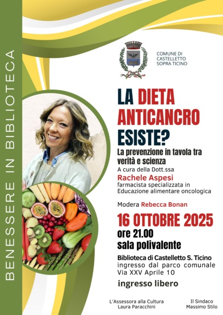 Nell’ambito del ciclo di incontri “Benessere in biblioteca”, la Biblioteca Comunale di Castelletto Sopra Ticino è lieta di ospitare la Dott.ssa Rachele Aspesi, farmacista e specialista in Educazione alimentare oncologica, che presenterà il suo libro: “La dieta anticancro esiste? La prevenzione in tavola tra verità e scienza”