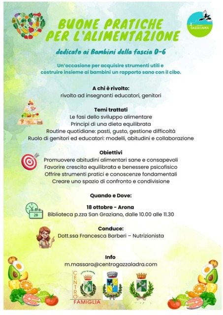 Il Coordinamento Pedagogico Territoriale di Invorio, in collaborazione con la Biblioteca e il Centro Famiglia del Comune di Arona, organizza il 18 ottobre dalle 10 alle 11.30 presso la Biblioteca di Arona un incontro rivolto ad insegnanti, educatori, genitori dal titolo “Buone Pratiche per l’alimentazione” nell’ambito delle iniziative rivolte allo 0-6. È un’occasione per acquisire strumenti utili e costruire un rapporto sano con il cibo.