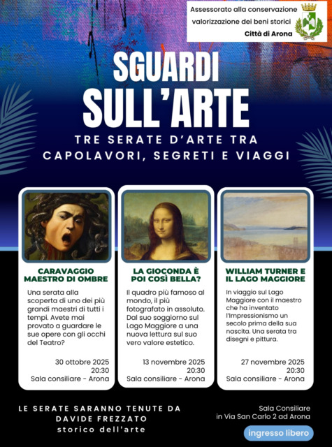 L’Assessore Davide Casazza sottolinea: “Con questo ciclo di incontri intendiamo rendere l’arte e la cultura un’esperienza viva e partecipata. La storia dell’arte, raccontata con passione e rigore, diventa un’occasione di incontro e di crescita condivisa per tutta la cittadinanza, uno “sguardo” come richiama il titolo verso un racconto pieno di immagini e significati. Inoltre i temi della serata sono stati scelti proprio per il loro legame con il Arona e con il lago Maggiore, unendo così il racconto artistico di grandi personaggi con il nostro territorio.”