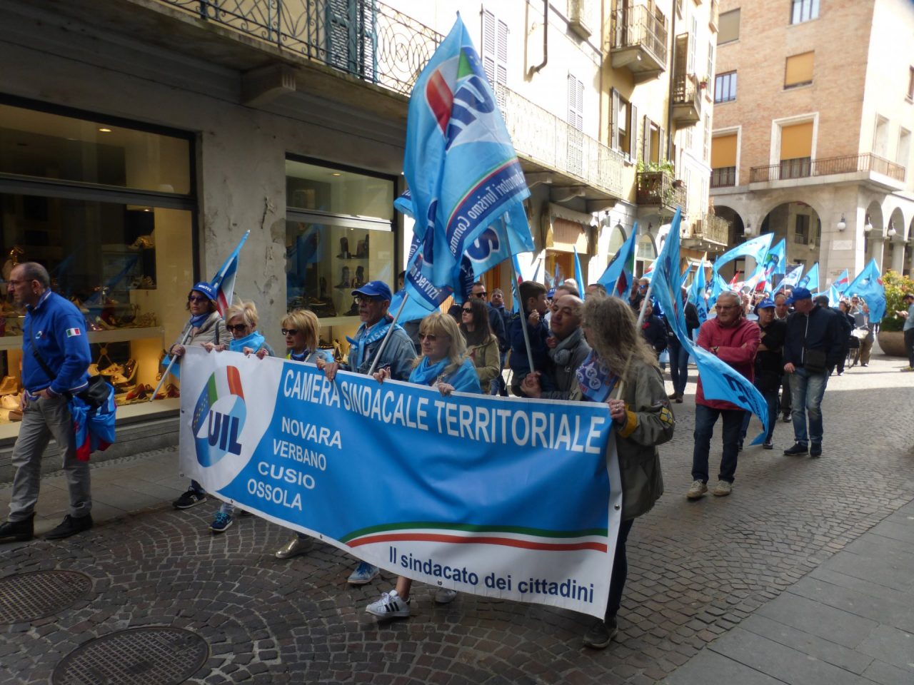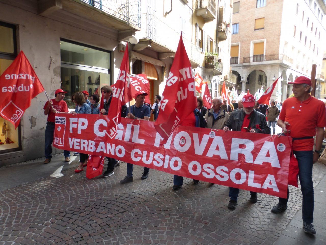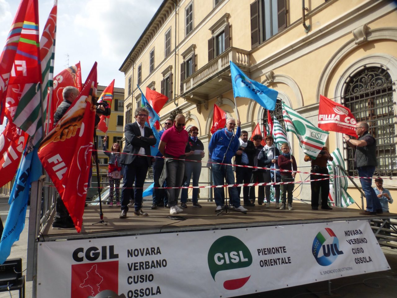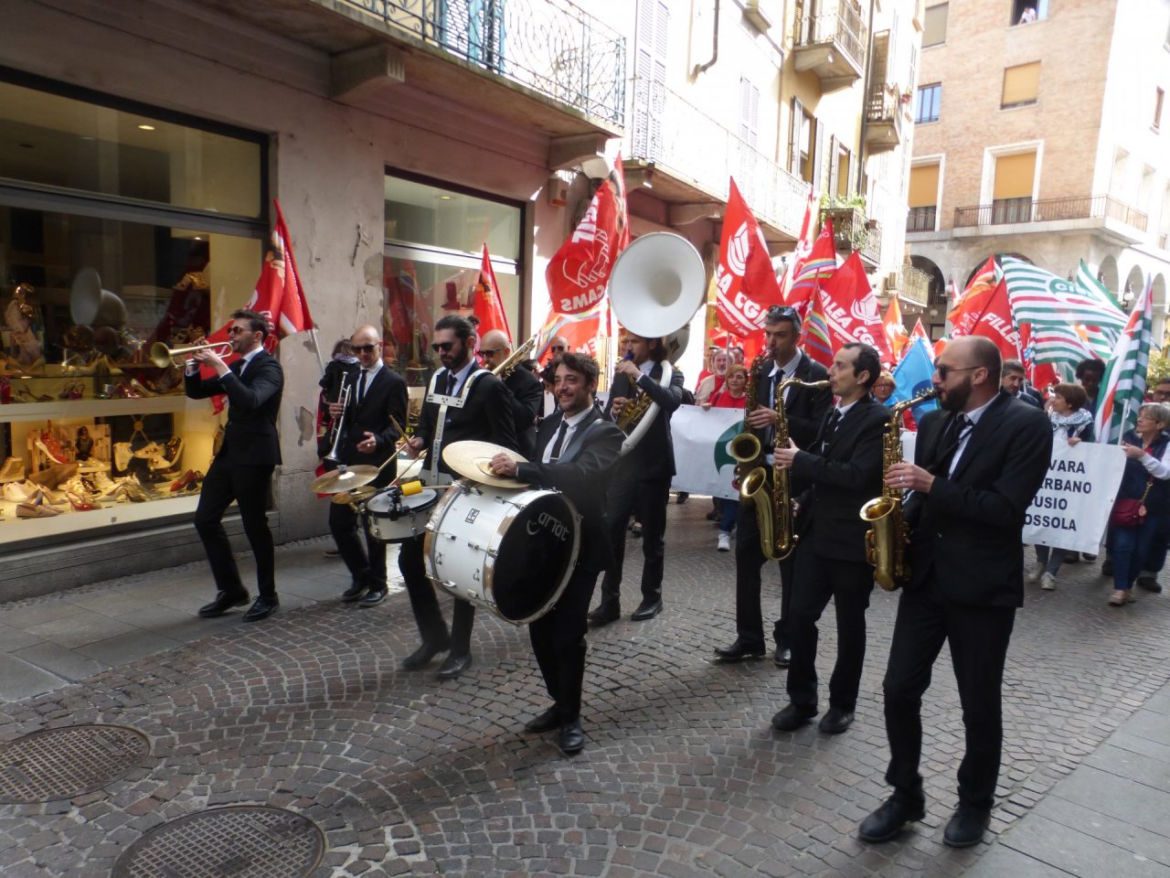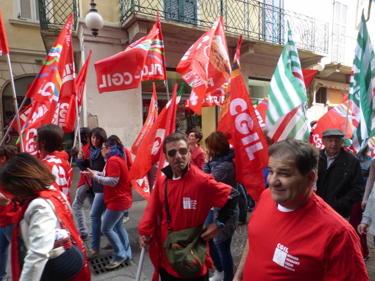 Il comizio sul palco di piazza Gramsci ha chiuso la manifestazione unitaria dei sindacati che si era aperta con il lungo corteo che da piazza Cavour ha attraversato le vie del centro accompagnato da centinaia di bandiere, striscioni e dalle note della Banda Cadabra di Torino e della Banda Margherita di Cameri.
