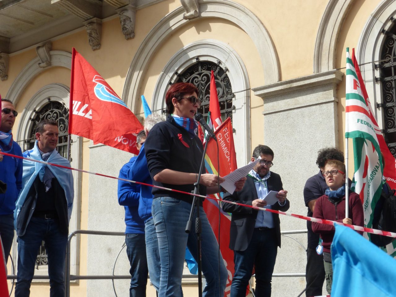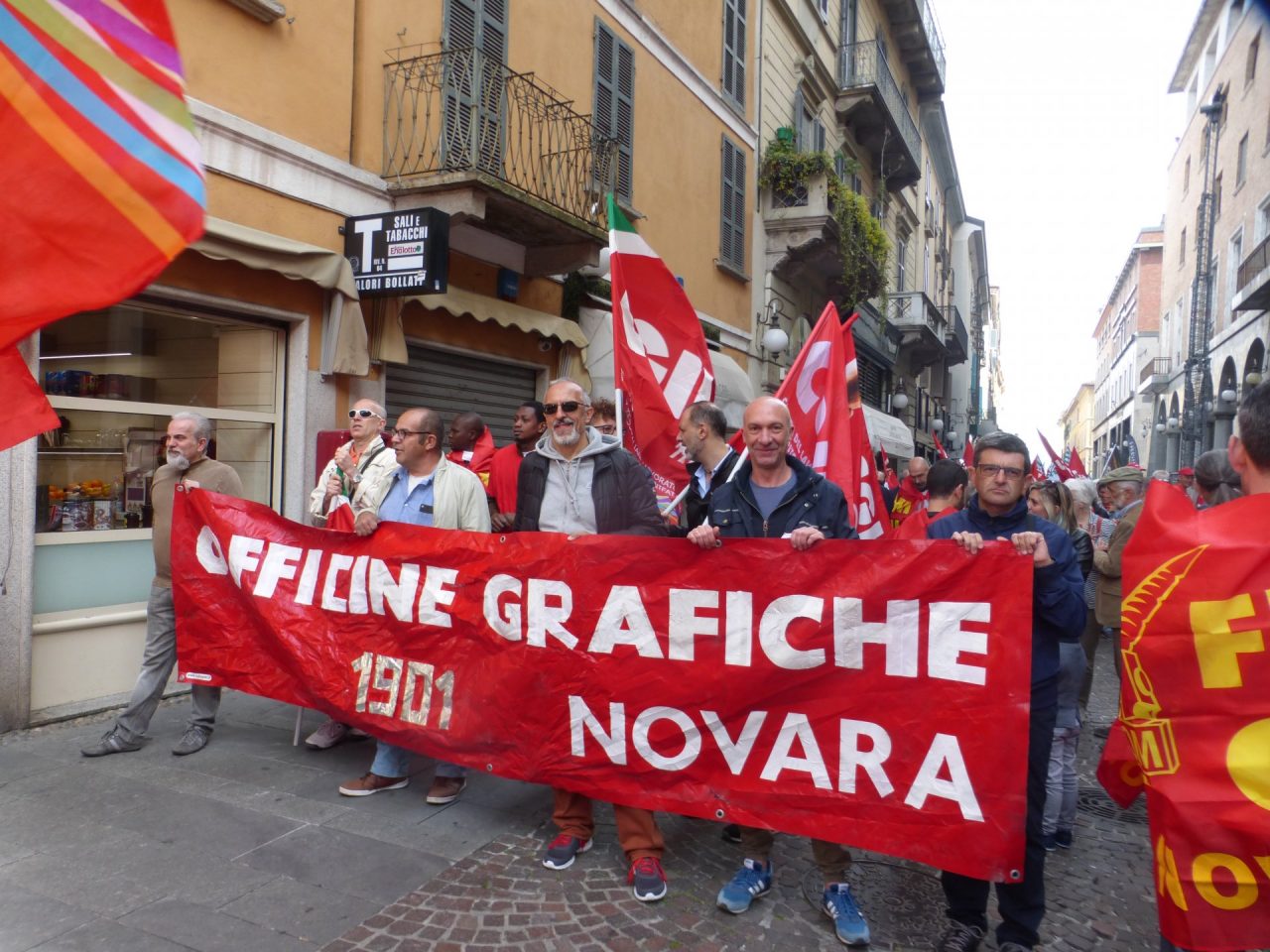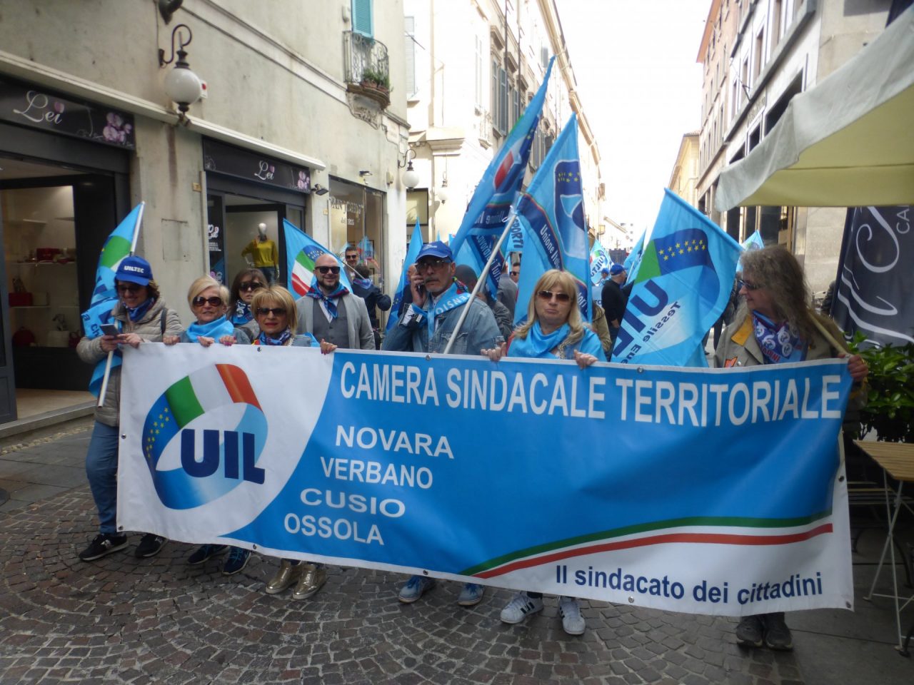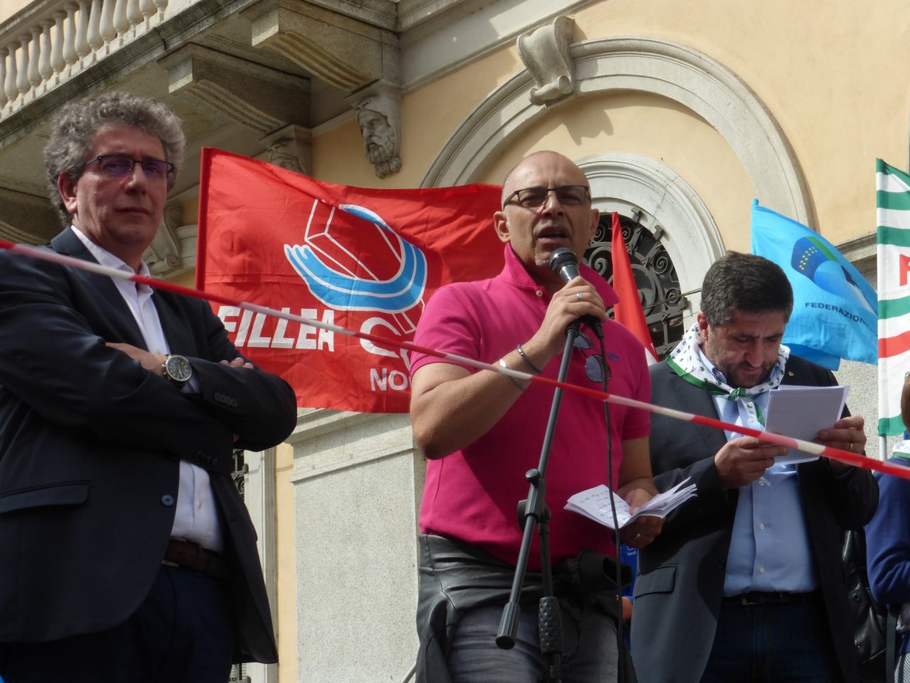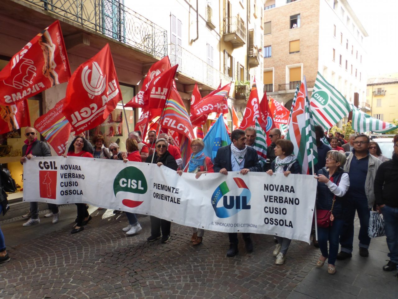 Il comizio sul palco di piazza Gramsci ha chiuso la manifestazione unitaria dei sindacati che si era aperta con il lungo corteo che da piazza Cavour ha attraversato le vie del centro accompagnato da centinaia di bandiere, striscioni e dalle note della Banda Cadabra di Torino e della Banda Margherita di Cameri.
