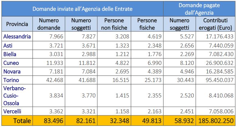 Alla data del 3 luglio, in Piemonte, sono stati 82 mila i soggetti che hanno presentato domanda: 49.800 sono contribuenti persone fisiche, mentre 32.300 persone non fisiche. La maggior parte delle istanze presentate fanno capo alla provincia di Torino, con 42.468 richieste e un contributo erogato pari a 95 milioni di euro. Seguono poi le province di Cuneo, con 11.933 domande e 27 milioni di euro, Alessandria con 7.966 istanze e 17 milioni di importo e Novara (7.181 e 16 milioni). Più distanziate le restanti province: Verbano-Cusio-Ossola (3.834 e 8 milioni), Asti (3.721 e 7 milioni), Vercelli (3.362 e 7 milioni) e Biella (3.031 e 7 milioni).