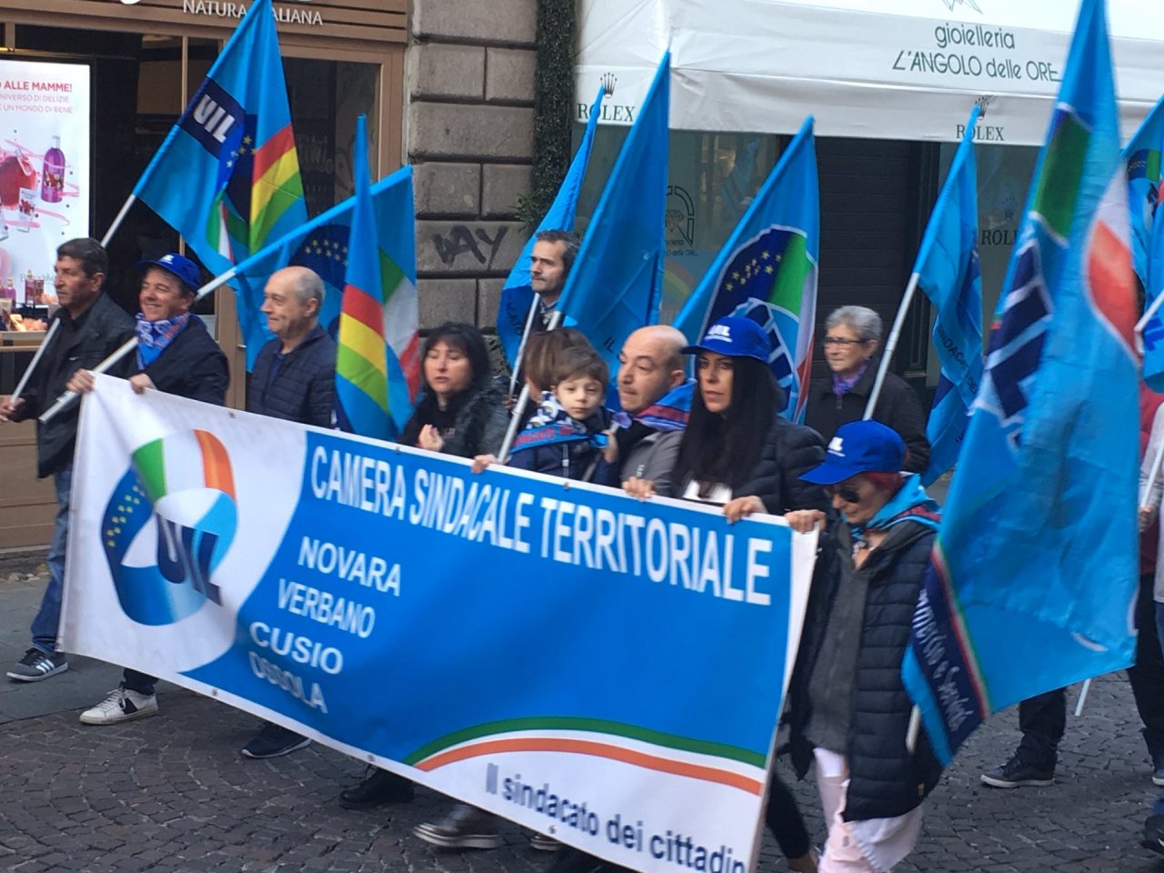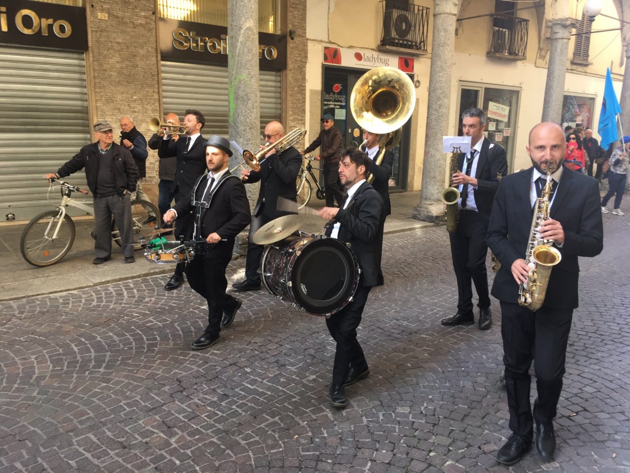 Prima di arrivare in piazza Grmasci, il corteo ha sfilato per le vie della città, accompagnato dalle note della banda Margherita di Cameri e della marching band Bandakadabra.