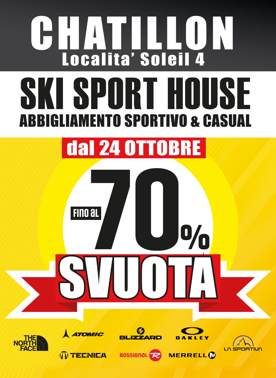 Quando si parla di abbigliamento sportivo e outdoor di qualità, il riferimento in Valle d’Aosta è uno solo: Ski Sport House. E da venerdì 24 ottobre lo storico punto vendita di Località Soleil 4 dà il via allo Svuotatutto sottocosto, con sconti fino al 70% su una selezione eccezionale di capi firmati dai migliori brand internazionali.