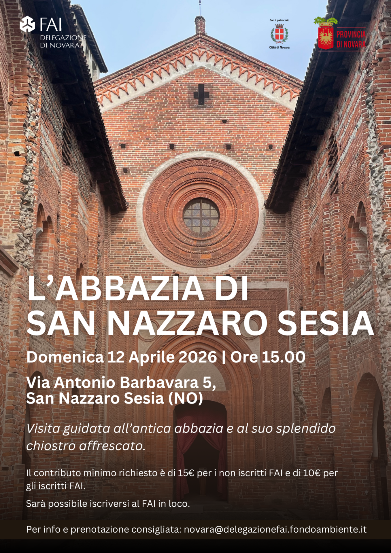 La Delegazione FAI di Novara è lieta di invitare il pubblico a partecipare all’evento “L’Abbazia di San Nazzaro Sesia”, delle esclusive visite guidate all’interno dell’abbazia, in programma domenica 12 aprile 2026 a partire dalle 15 su turni.