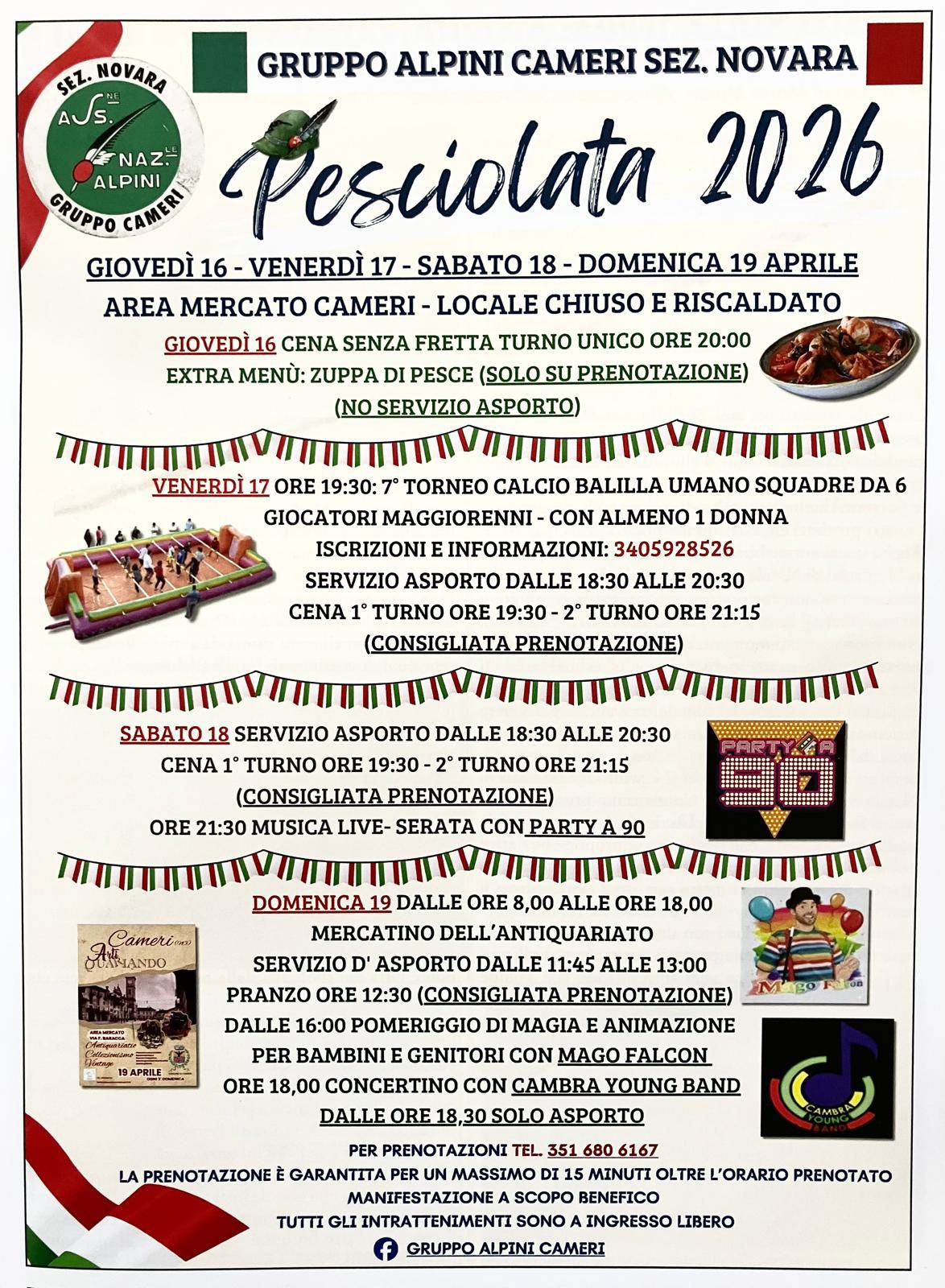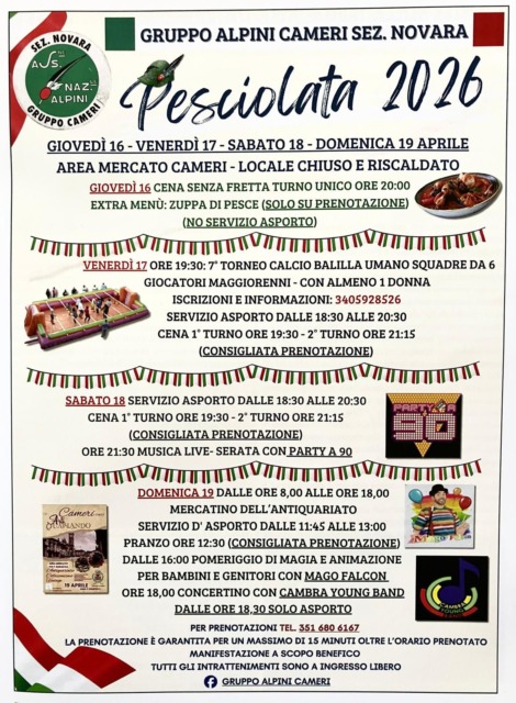 Nel weekend prosegue a Cameri la “Pesciolata 2026” nell’area mercato di via Sabbioncelli, con un fine settimana ricco di appuntamenti per tutte le età. Nell’ambito della manifestazione, sabato 18 aprile spazio alla tradizione gastronomica con il servizio d’asporto attivo dalle 18.30 alle 20.30 e le due cene organizzate in doppio turno. A seguire, dalle 21.30, musica live con una serata tutta da ballare sulle note del “party a 90”. Domenica 19 la giornata si apre invece con il mercatino dell’antiquariato, in programma dalle 8 alle 18. A pranzo torna la proposta gastronomica, mentre nel pomeriggio l’attenzione si sposta su famiglie e bambini con uno spettacolo di magia e animazione. A chiudere il weekend saranno la musica dal vivo con il concertino della Cambra Young Band e il servizio serale di asporto.