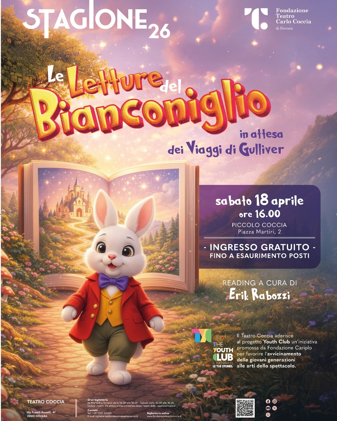 Un pomeriggio dedicato a grandi e piccoli all’insegna della lettura e della fantasia. Sabato 18 aprile, alle 16, il Piccolo Coccia di Novara (in piazza Martiri della Libertà) ospita “Le letture del Bianconiglio”, un appuntamento pensato per tutta la famiglia. Il reading sarà curato da Erik Rabozzi. L’iniziativa è organizzata dalla Fondazione Teatro Carlo Coccia e prevede ingresso libero e gratuito.