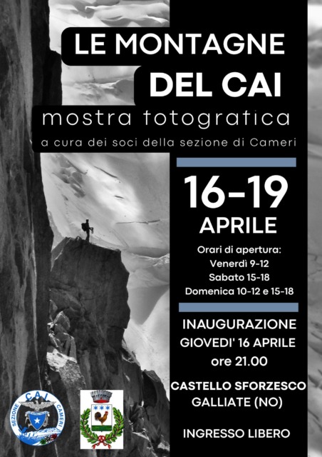 Inaugurata giovedì 16 aprile, sarà visitabile anche nel weekend la mostra fotografica “Le montagne del Cai” organizzata dalla sezione di Cameri nel castello di Galliate. Orari: sabato 15-18; domenica 10-12 e 15-18.